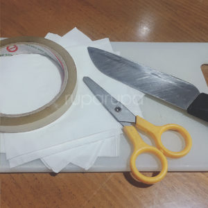 Siapkan peralatan yang dibutuhkan berupa kertas tisu, isolasi, gunting, pisau dan talenan.