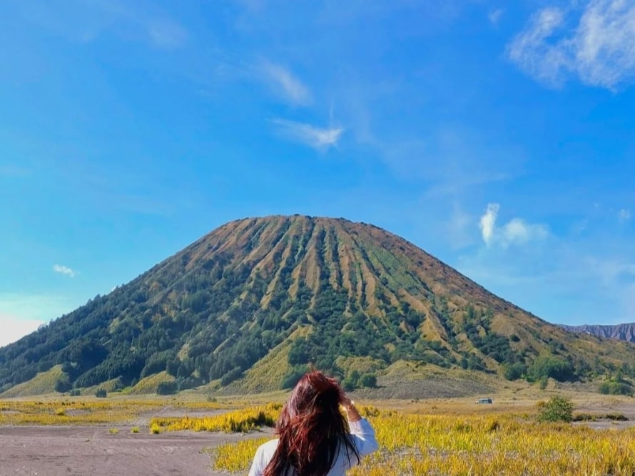 Dari atas Gunung Bomo, kamu bisa menikmati indahnya matahari terbit dan terbenam. Selain itu, hamparan rumput hijau juga memanjakan mata.