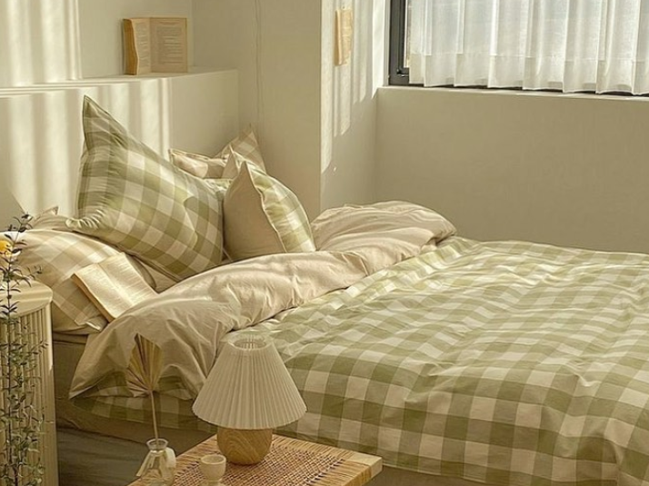 Mungkin kalian seringkali melihat bedcover di kamar bergaya Korea berwarna polos. Namun, jika kalian bosan dengan satu warna, kalian bisa membeli bedcover dengan motif gingham.