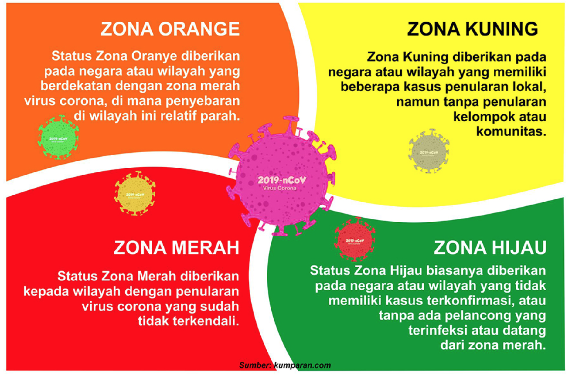 Zona ini sendiri terbagi dalam beberapa warna, yaitu zona merah, oranye, kuning, dan hijau. Masing-masing warna tersebut menunjukkan tingkat penyebaran virus korona di dalam suatu lingkungan.
