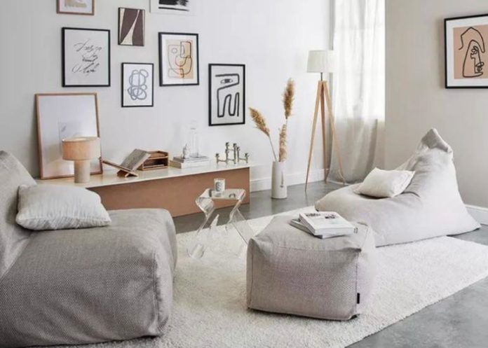 2. Desain ala Scandinavian dengan bean bag dan bingkai foto cantik
