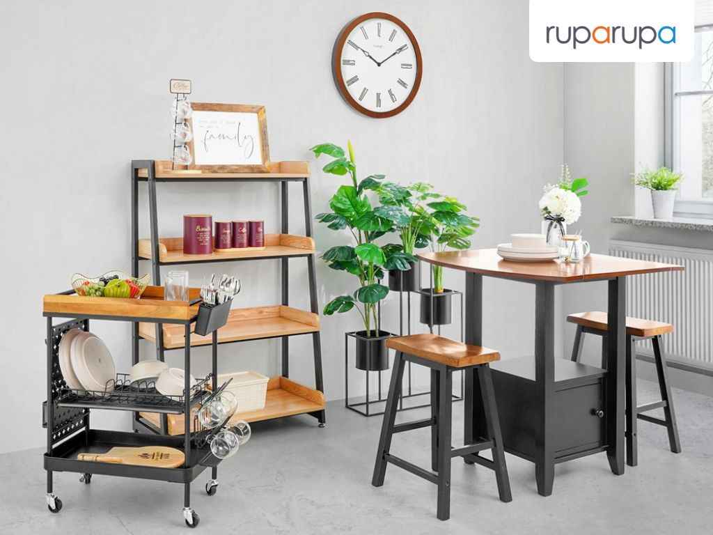 Salah satunya adalah rak dan troli dapur multifungsi yang bisa kamu letakkan di tengah ruangan. Selain itu, kamu juga bisa menciptakan mini bar dengan rak ini, lho. Cukup gunakan kursi bar yang tingginya pas dengan meja.