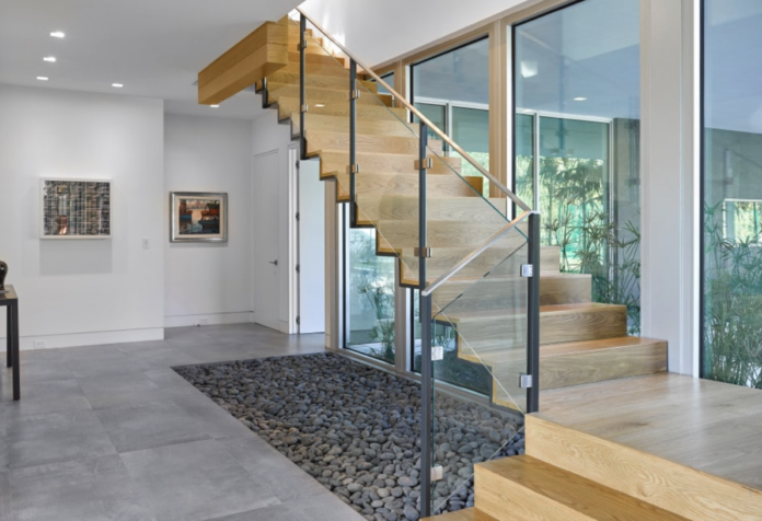 Kamu tertarik dengan desain rumah yang futuristik modern? Maka, kamu dapat mencoba memadukan material kayu dan kaca secara bersamaan. Untuk tips tambahan, kamu dapat menambahkan detailing lampu LED pada sisi bawah anak tangga agar pemaksimalan cahaya pada tangga tampak luar biasa megah dan elegan.