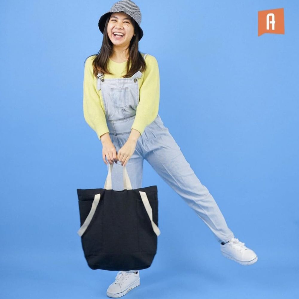 Supaya tetap bergaya, gunakan kaus polos dengan jaket sebagai outer. Lalu, kamudapat memakai tote bag untuk menyimpan berbagai barang bawaan, seperti berikut ini.