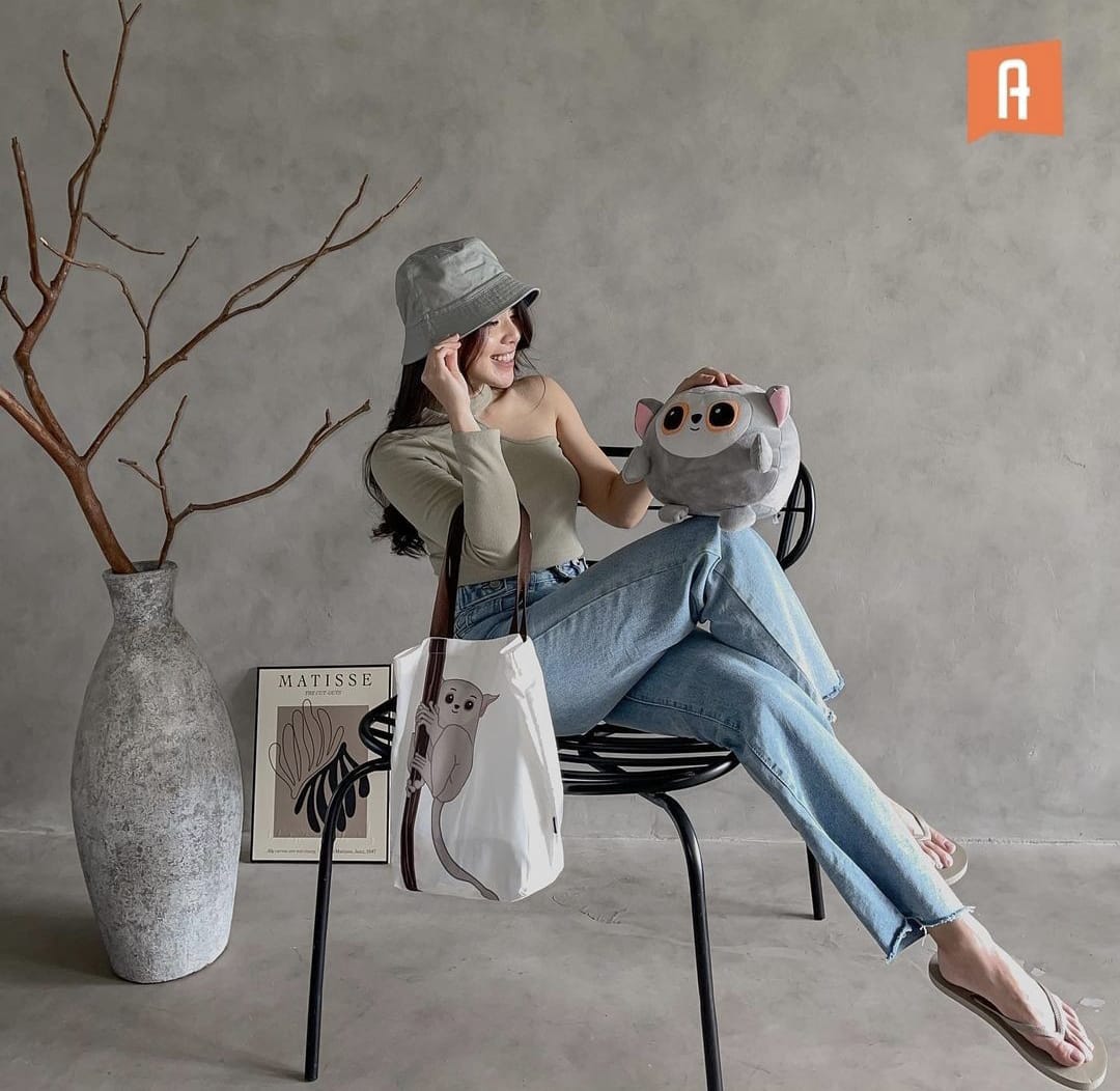 Biar semakin stylish, kamu bisa, lho, pakai tote bag dengan motif lucu dan sandal cantik, seperti berikut ini.