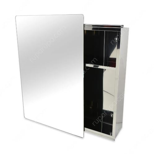 Lengkapi juga kamar mandi Anda dengan cermin. Cermin sekaligus lemari kabinet ini memiliki desain ergonomis yang praktis. Ruangan kamar mandi pun dapat terlihat lebih luas dan tertata dengan kabinet dinding seperti ini. Cocok untuk kamar mandi modern sederhana.