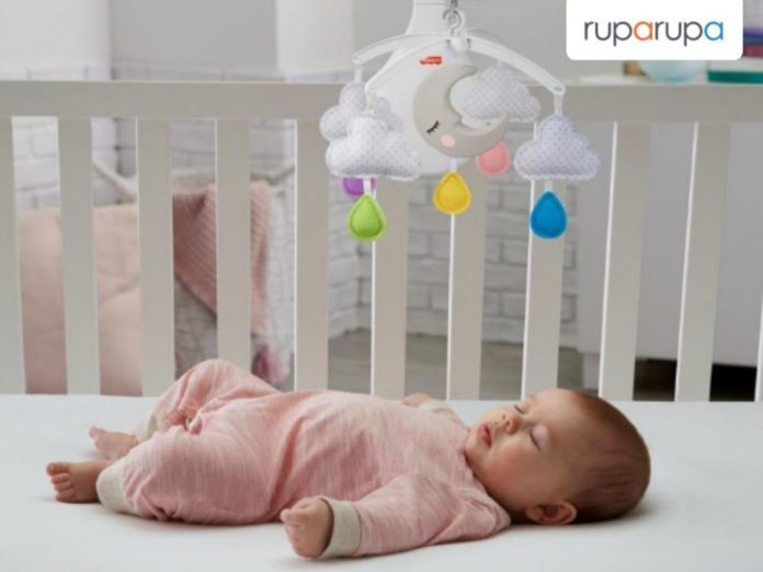 Selain itu, mainan gantung di atasnya juga bisa menemani bayi bermain dan membuatnya terhibur, seperti berikut ini.
