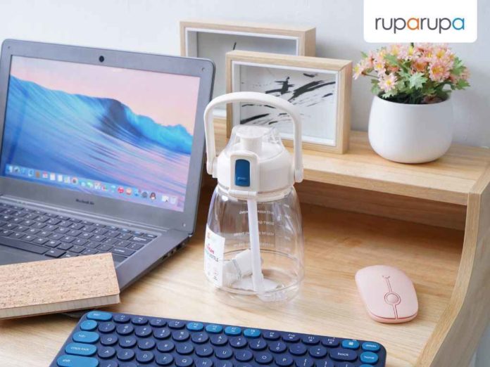 Kamu bisa menyediakan botol minum 1 liter sebagai salah satu perlengkapan kantor yang bisa dibawa ke mana-mana, seperti di bawah ini.