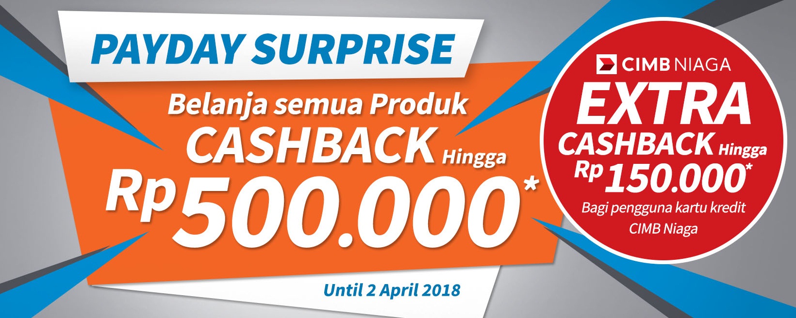 Mau coba fasilitas cashback saat gajian? Ikutan Payday Surprise yang berlangsung hingga 2 April 2018, di Ruparupa.com. Belanja apa saja, bisa dapat cashback s.d Rp 500.000. Plus jika Anda pengguna kartu kredit CIMB Niaga, bonus ekstra cashback lagi hingga Rp 150.000. Total, Anda akan menghemat bujet s.d Rp 650.000! Wah, bisa beli produk apa lagi ya dengan voucher Rp 650.000?