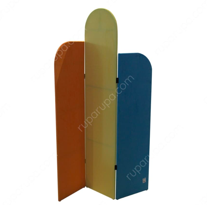 Partisi ini terdiri dari 3 panel yang mudah untuk dilipat dan disimpan saat tidak digunakan. Terbuat dari material kayu dengan lapisan kain velvet berwarna warni yang mampu menambah aksen dekoratif pada ruangan.