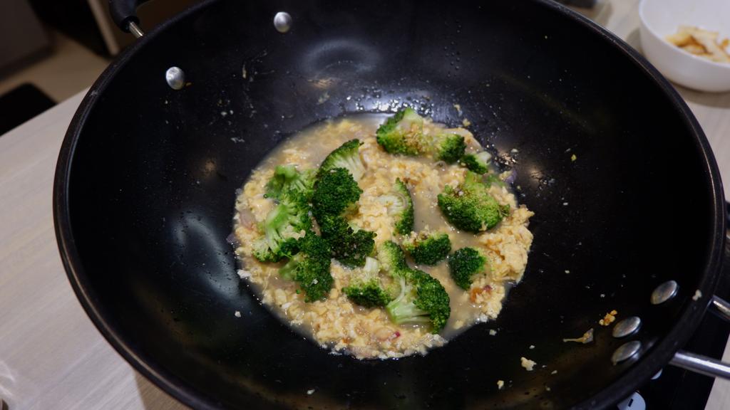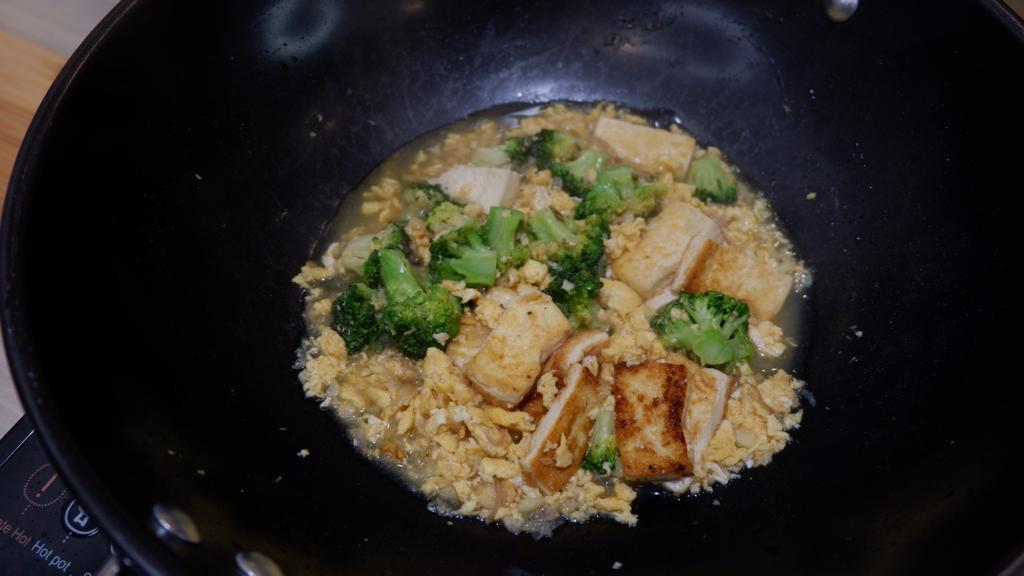 7. Bila telur sudah matang, kamu bisa meniriskan brokoli yang telah direndam. Lalu, masukkan brokoli, saus tiram, garam, dan kaldu bubuk sesuai selera. Kemudian, tambahkan air dan aduk semua bahan tercampur rata.