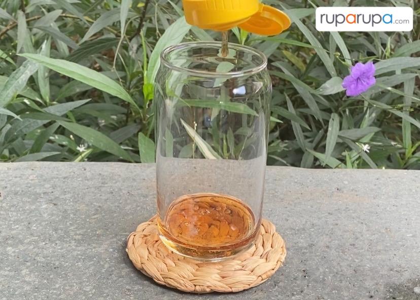 2. Siapkan gelas cantik dan tuangkan madu ke dalamnya sebagai bagian dasar. Kalau suka manis, kamu bisa menambahkan madu atau gula cair, ya.