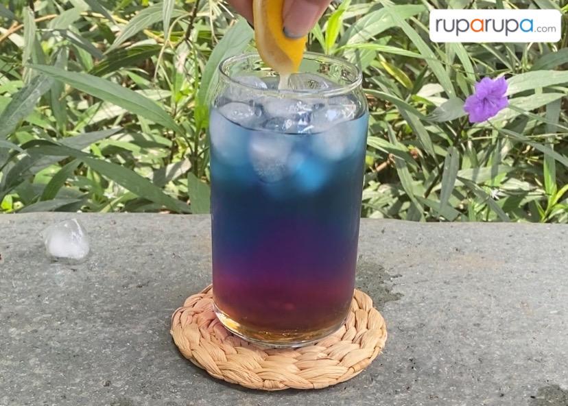5. Ambil potongan buah lemon dan peras ke dalam gelas. Kamu akan melihat warna air bunga telang akan berubah dari biru menjadi ungu.