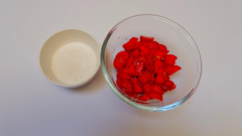 1. Pertama-tama, rendam strawberry menggunakan air garam selama kurang lebih 10 menit. Hal ini bertujuan untuk mengeluarkan ulat yang ada pada buah strawberry. Kemudian, iris tipis semua buah strawberry dan sisihkan ke dalam wadah.