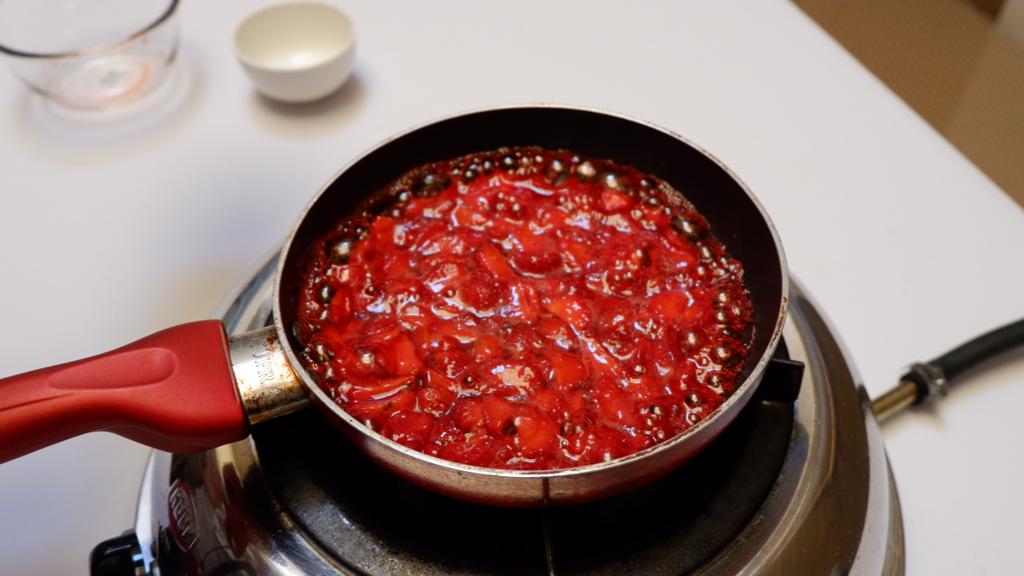 2. Panaskan wajan dengan api kecil, lalu masukkan buah strawberry dan gula pasir. Aduk terus hingga tercampur rata dan berair.