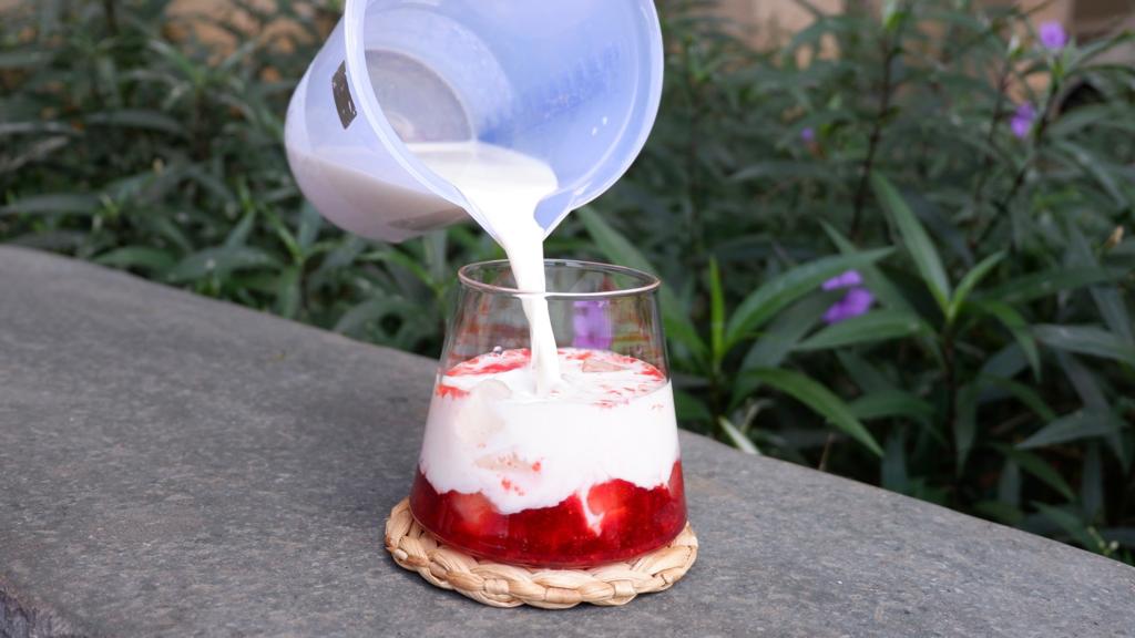 Kamu dapat mengoleskan selai strawberry ke sisi-sisi gelas agar tampilannya nanti menjadi lebih cantik ya, Ruppers. Sisakan sekitar 1 sdt selai untuk menjadi hiasan pada bagian atas minuman nantinya.