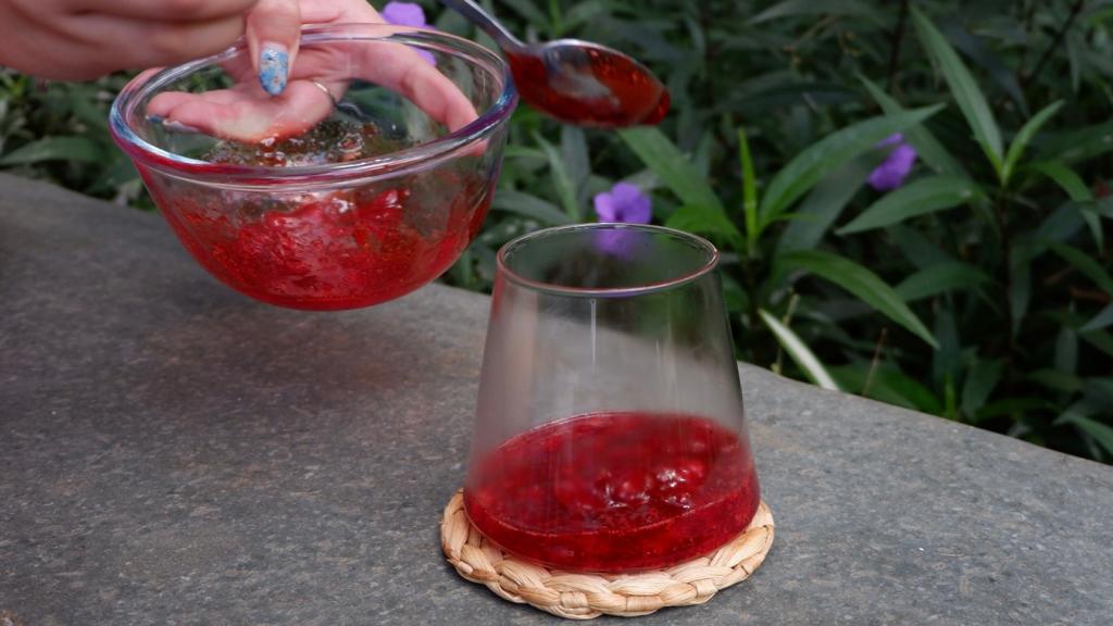 4. Siapkan gelas cantik yang ingin digunakan dan masukkan selai strawberry kamu ke dalamnya.