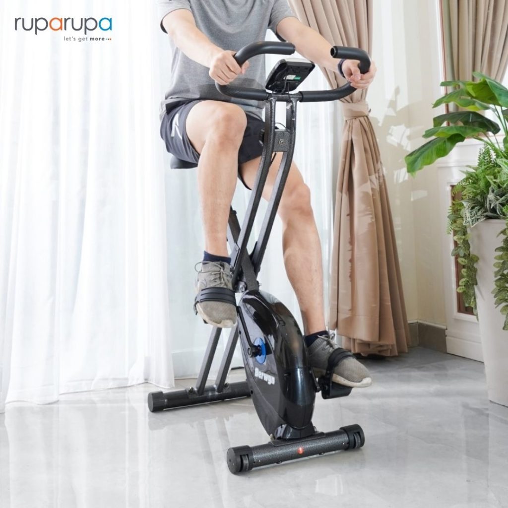 Salah satu caranya dengan memiliki alat sepeda statis, seperti di bawah ini. Anda bisa menggunakannya di sela-sela bekerja di rumah.
