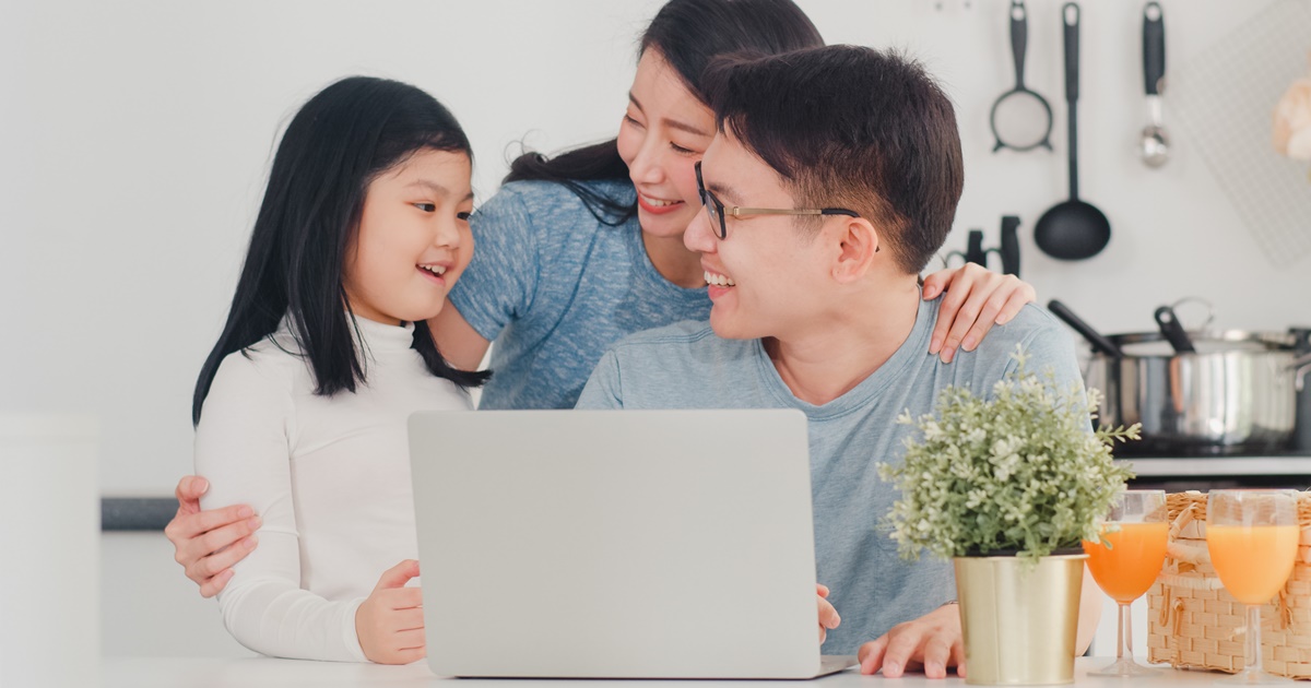 Young Asian family enjoy using laptop together at home. Lifestyle young husband, wife, and daughter happy hug and play after have breakfast in modern kitchen at house in the morning concept.