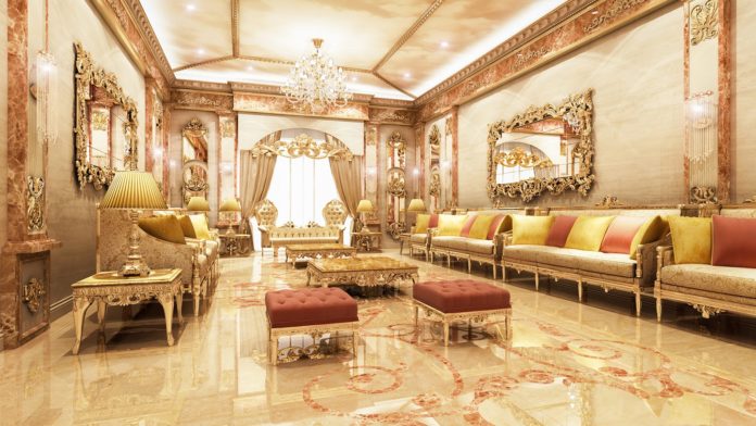 Lalu, tambahkan aksen emas pada ukiran dinding untuk memberi tampilan mewah. Anda  bisa menambahkan materi kayu pada bagian dinding luar rumah agar terlihat lebih klasik.